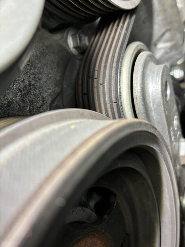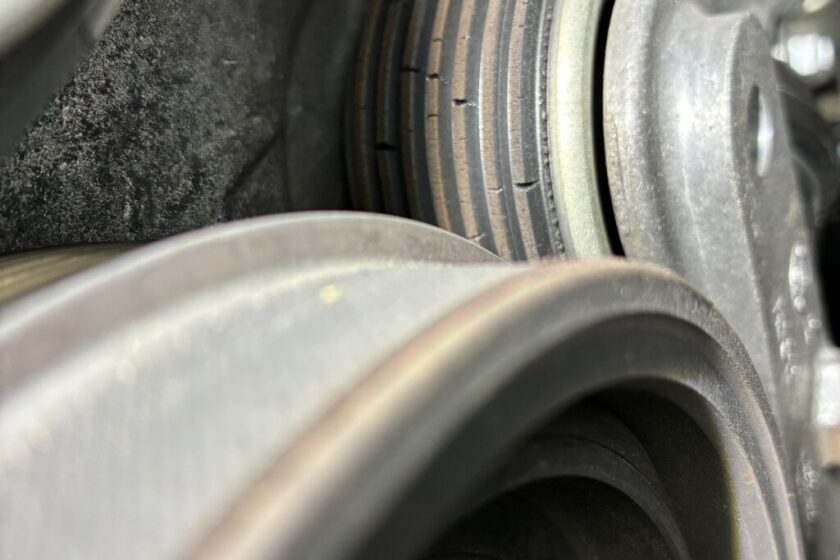 車検点検整備にて平成29年式スズキ ソリオをお客様よりお預かりいたしました。 法定点検項目に沿って各部を点検したところ、エンジンルーム内の補機ベルトに亀裂が見つかりました。補機ベルトはクランクプーリーより駆動され、発電機やウォーターポンプ・エアコンコンプレッサーを作動させている重要な部品です。